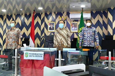 Penjabat Sementara (Pjs) Wali Kota Medan Ir Arief Sudarto Trinugroho MT mengikuti Rapat Koordinasi Nasional (Rakornas) Pengendalian Inflasi 2020 secara virtual di Command Center Balai Kota Medan, Kamis (22/10). Tujuannya, guna menyamakan visi, misi, langkah dan persepi dalam menghadapi dan mengendalikan inflasi di Indonesia.