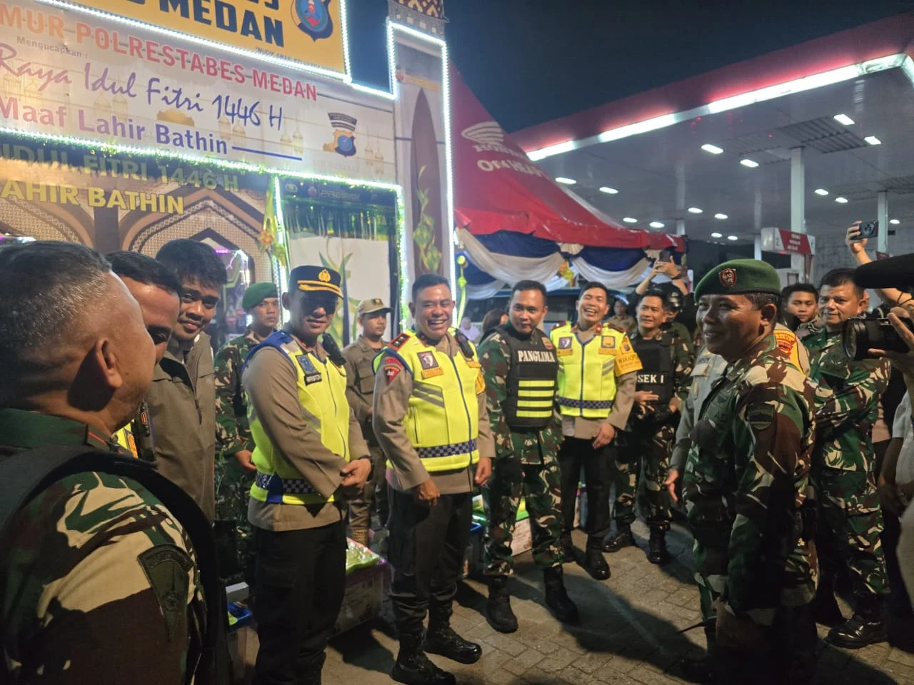 MEDAN - Pastikan malam takbiran kondusif Kapolda Sumut, Irjen Pol.Whisnu Hermawan Februanto, S.I.K.,M.H., bersama Gubenur Sumut, Muhammad Bobby Afif Nasution, Pangdam I/BB, Mayhen Rio Firdianto, Kapolrestabes Medan, Kombes Pol.Gidion Arif Setyawan, Danlamtamal I Belawan, Brigjen TNI ( Mar) Jasiman Purba, S.E.,CHRMP., Dankosek I Medan, Marsma TNI, Toto Ginanto,S.T., M.A.P., M.Han, Danlanud Soewondo, Kolonel Laut (P) Alamsyah Putra Tanjung, M.Tr.Opsla dan juga Forkopimda Sumut turun langsung memantau kesiapan pengamanan malam takbiran Idul Fitri 1446 Hijriah diseluruh Pos Pam Lebaran yang ada di Kota Medan.